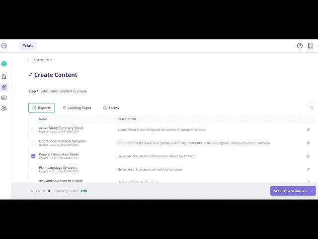Start by selecting your trial, then choose the report type, language, and location (with up to 10 language options).