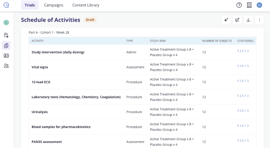 Protocol citations embedded every activity traces back to its source in the protocol, supporting audit readiness, regulatory inspection, and deviation management